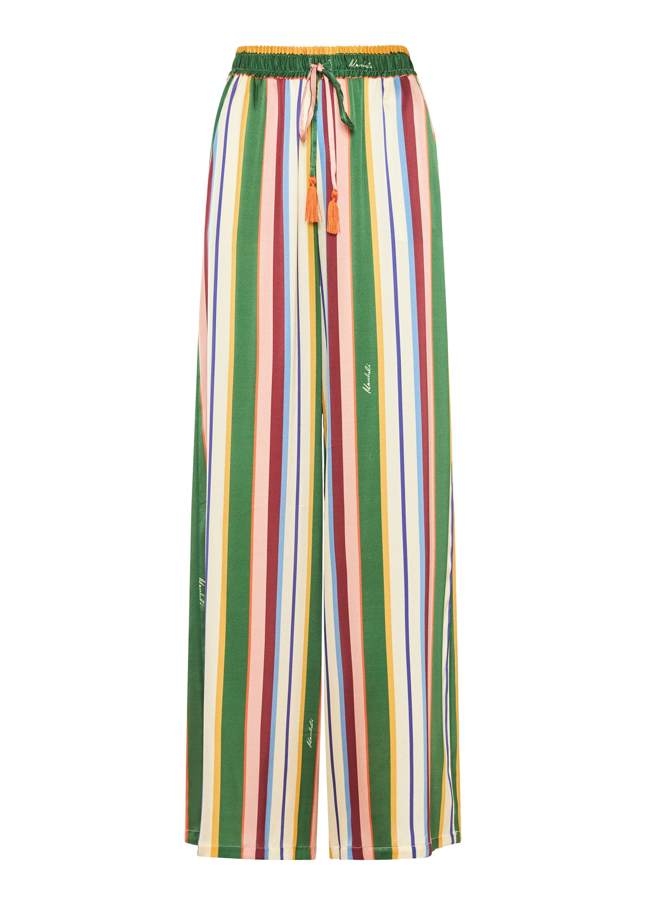 Stylish wide-leg trousers crafted from luxurious printed silk, featuring bold Sicilia stripes and practical pockets for a chic and comfortable look.