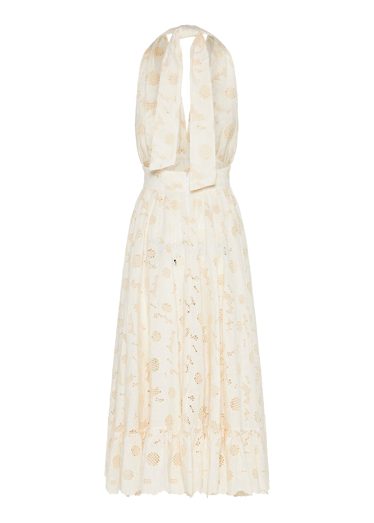 This captivating mid-length dress features a daring open back and a stylish halterneck tie, combining sophistication with a touch of allure. The halterneck design accentuates the neckline while providing an adjustable fit, making this dress perfect for both elegant and contemporary occasions.