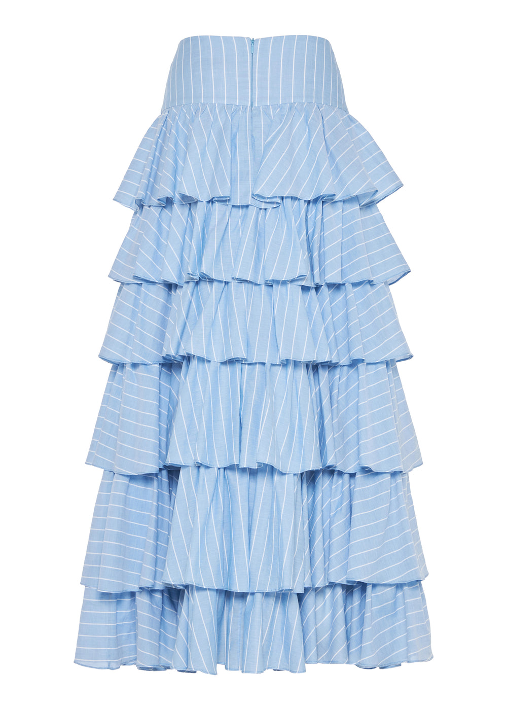 With its flattering layers, chic stripes, and luxurious cotton voile fabric, the Flared Ruffle Maxi Skirt is a must-have addition to your wardrobe for any season.