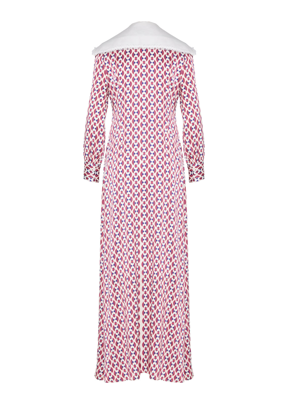 Step into sophisticated elegance with our Long Sleeve Shirtdress, crafted from luxurious CM Geometrical Printed Silk and cotton, showcasing exclusive designs inspired by Italian artistry. The Lavallière tie front and ruffled collar add a feminine, romantic touch to the classic shirtdress silhouette, making this piece both timeless and modern. The intricate Italian embroidery details along the trims elevate the design, adding a delicate, artisanal flair. Whether you're dressing up for an event or styling it for a more casual day, this dress is an essential addition to your wardrobe.