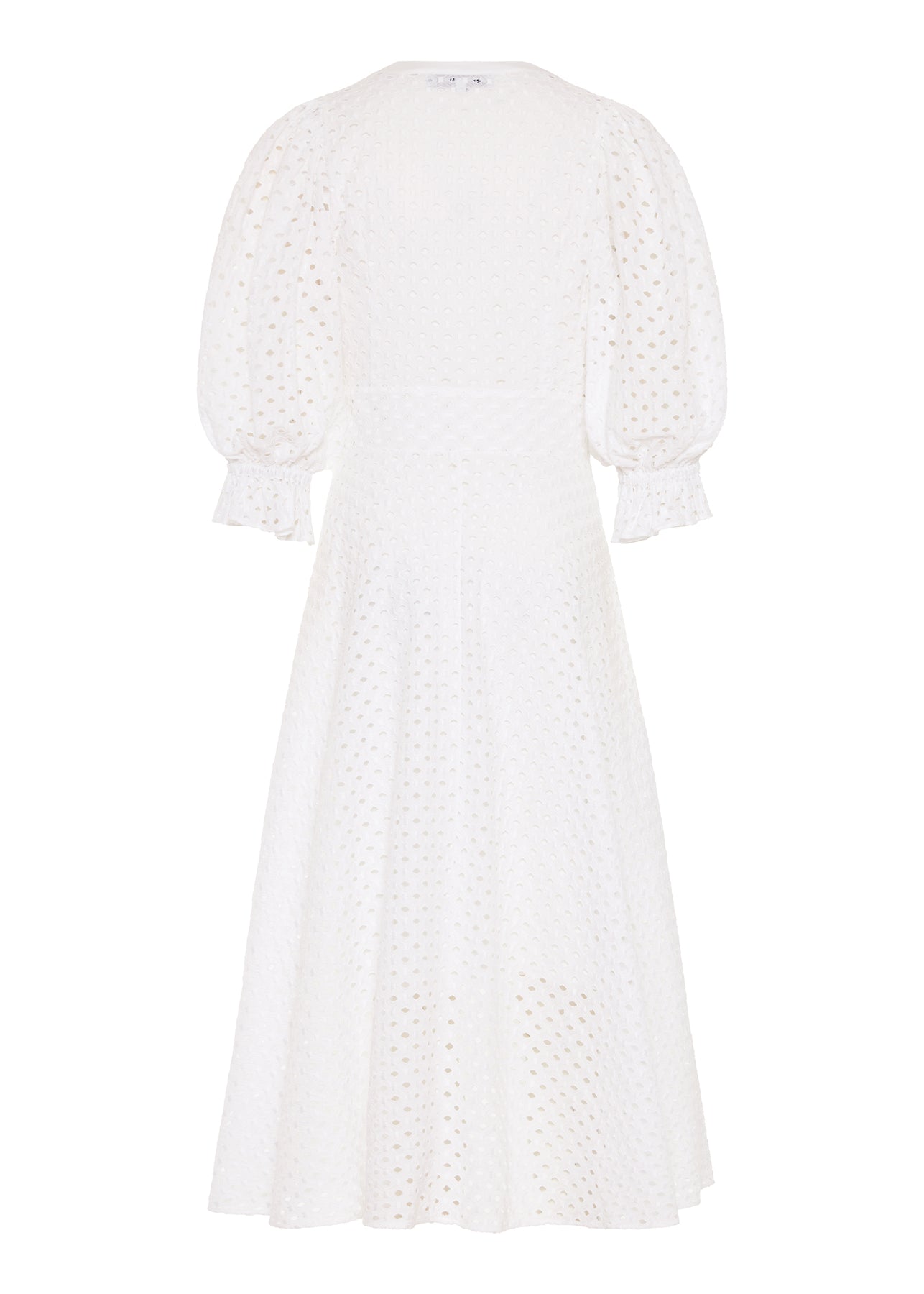 A classic shirt dress crafted from delicate Broderie Anglaise embroidery, featuring cloth-covered buttons and practical pockets for a refined, effortless elegance. Light, airy, and perfectly suited for summer sophistication.