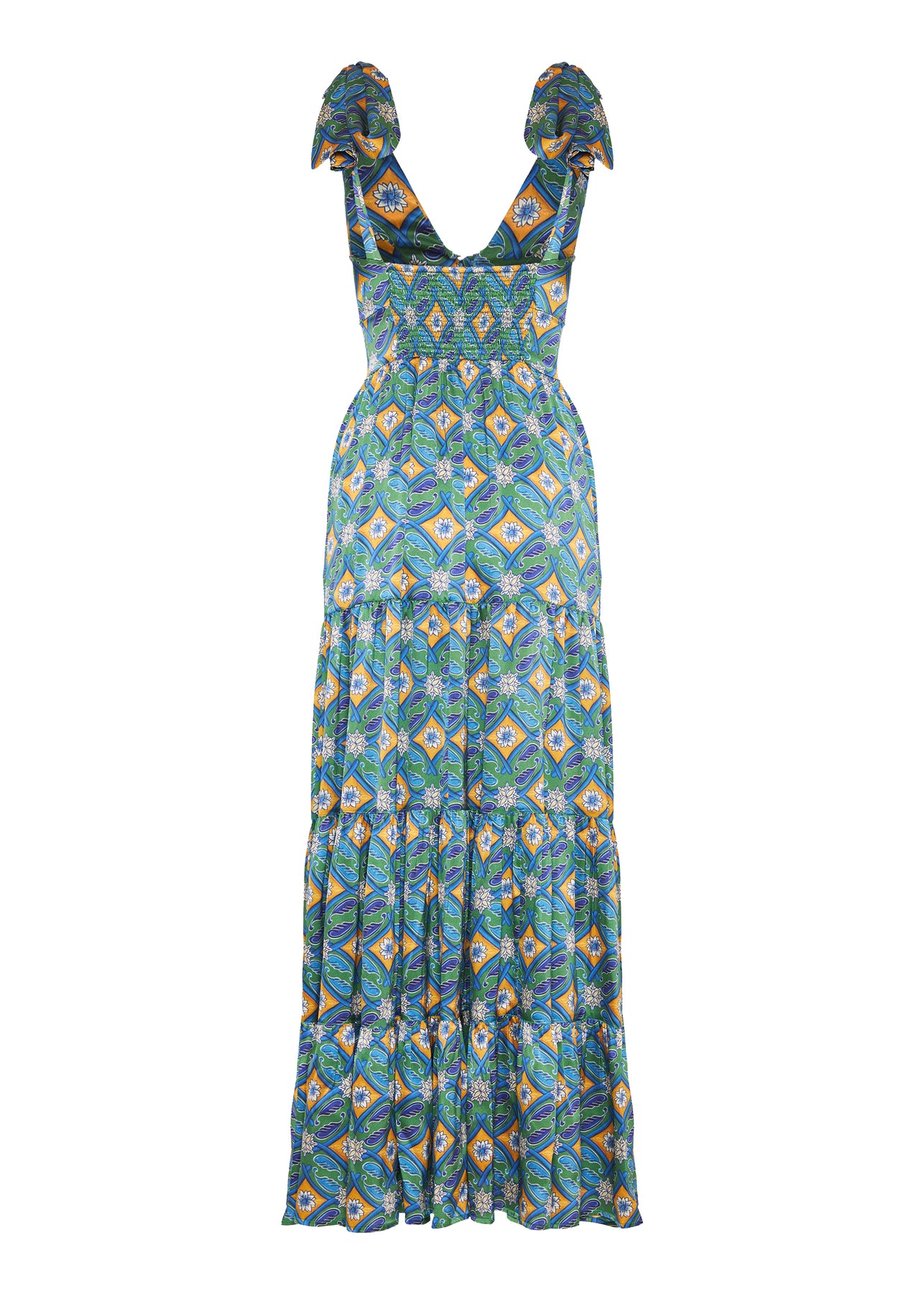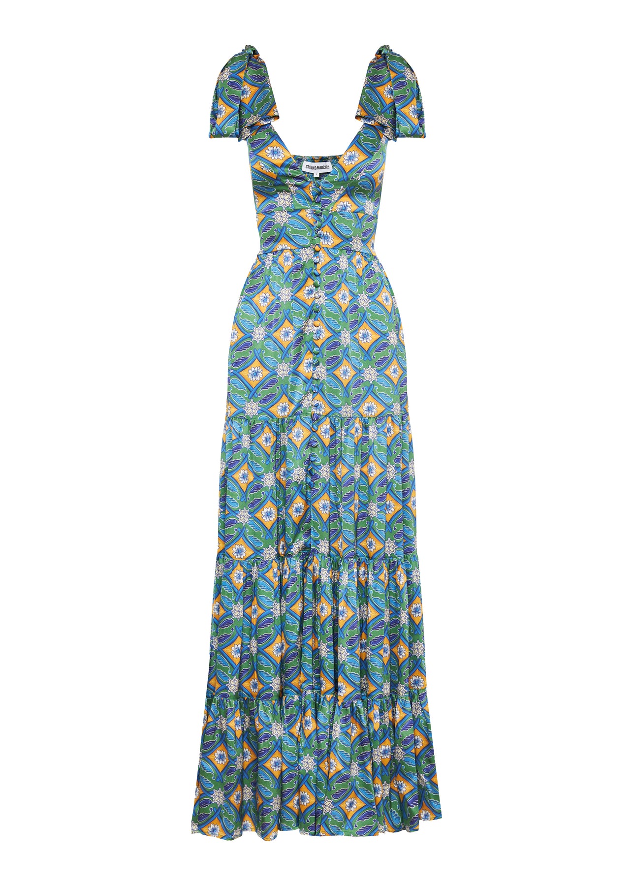 An elegant long dress crafted from luxurious printed silk, featuring a wide V-neckline, tiered skirt, and delicate cloth-covered buttons. Inspired by classic Sicilian ornaments and tiles, it blends effortless elegance with Mediterranean charm.