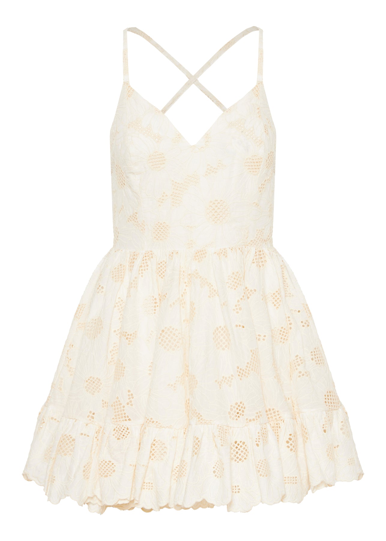 A playful mini dress crafted in delicate Broderie Anglaise cotton, featuring a tiered skirt, pockets, and adjustable back X straps for a feminine, summer-ready silhouette. Light, airy, and effortlessly elegant.