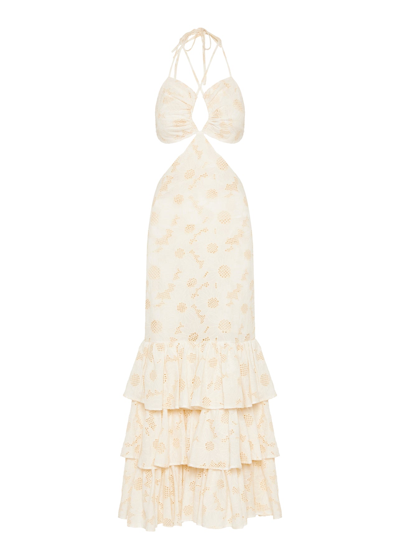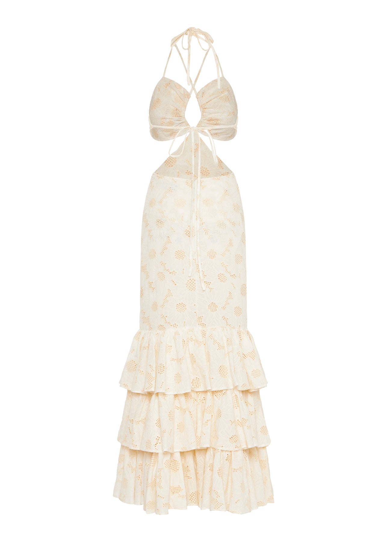 A flowing maxi dress in delicate Broderie Anglaise cotton, featuring playful ruffles, a bralette-style bodice, and midriff cutouts for a modern, sun-soaked silhouette. Light, airy, and effortlessly elegant, perfect for summer days.