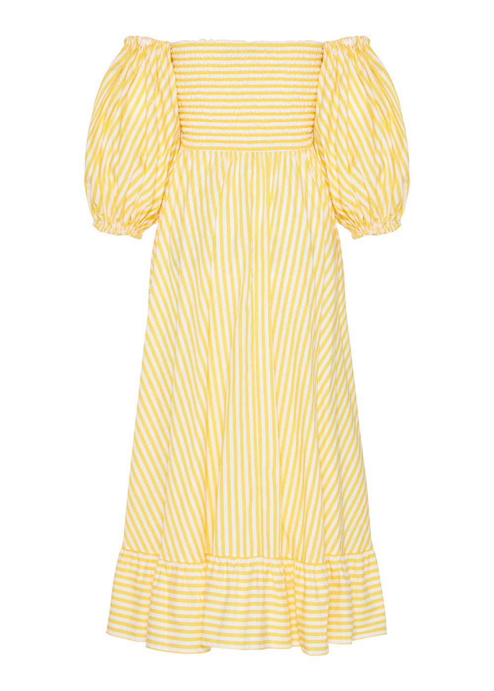 A modern ode to sun-drenched days, this mid-length smock dress is crafted in airy yellow-striped cotton. The silhouette is strapless with softly gathered elastic at the bodice for a close, comfortable fit, while voluminous puff sleeves add structure and ease. Designed to move effortlessly from seaside afternoons to evening dinners, it embodies a light, feminine energy with understated charm.