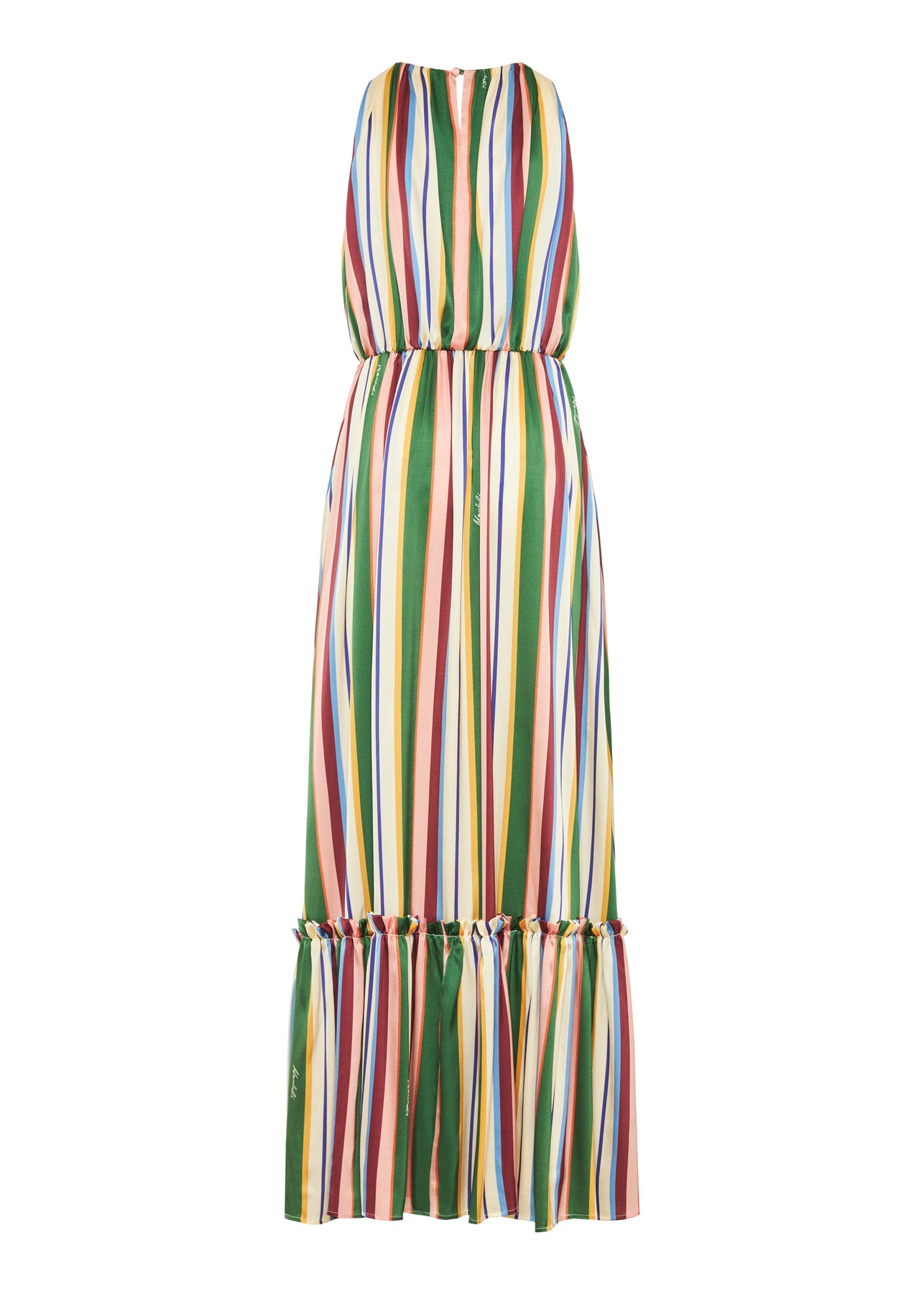 An elegant sleeveless long dress crafted from luxurious printed silk, featuring a voluminous tiered skirt and bold Sicilian stripes. Paired with a fringed belt, it evokes a graceful, sun-soaked Mediterranean silhouette.